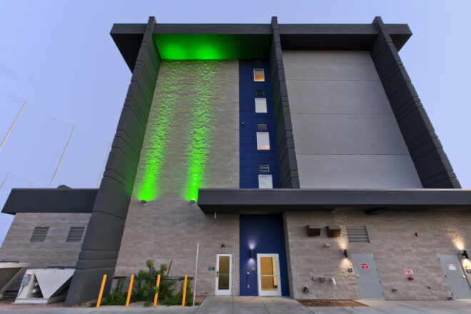 Five-story plus mechanical room penthouse. Four stories wood frame over structural steel podium. Three-hour fire separation.